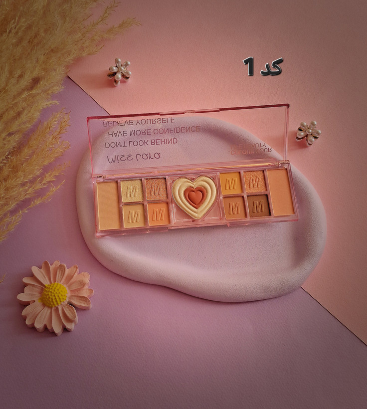 - ۸ رنگ سایه چشم با بافت مات و شاین دو رنگ رژگونه و هایلایتر قلبی